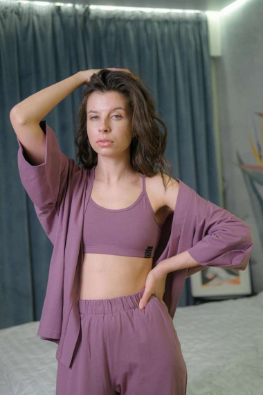 Хлопковый трикотаж премиум-класса, не скатывается и не садится при стирке. В серии Home идеально сочетаются топ, кимоно и брюки. Вы можете выбрать все позиции в одном оттенке или поиграть с сочетанием различных цветов.